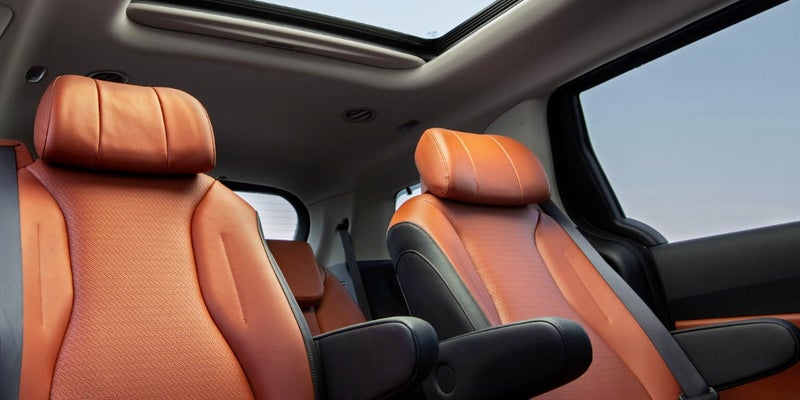 The 2023 Kia Carnival has seating for seven or eight, depending on which cabin configuration you select. The vehicle offers second-row VIP lounge seats that slide and recline. A second-row bench seat is available as an alternative option. All versions of the vehicle feature sliding and removable second-row seats and reclining third-row seats that can fold into the floor. You'll get 40.2 cubic feet of storage space behind the third row, 86.8 cubic feet with the third row folded down, and 145.1 cubic feet with the second and third rows folded down.