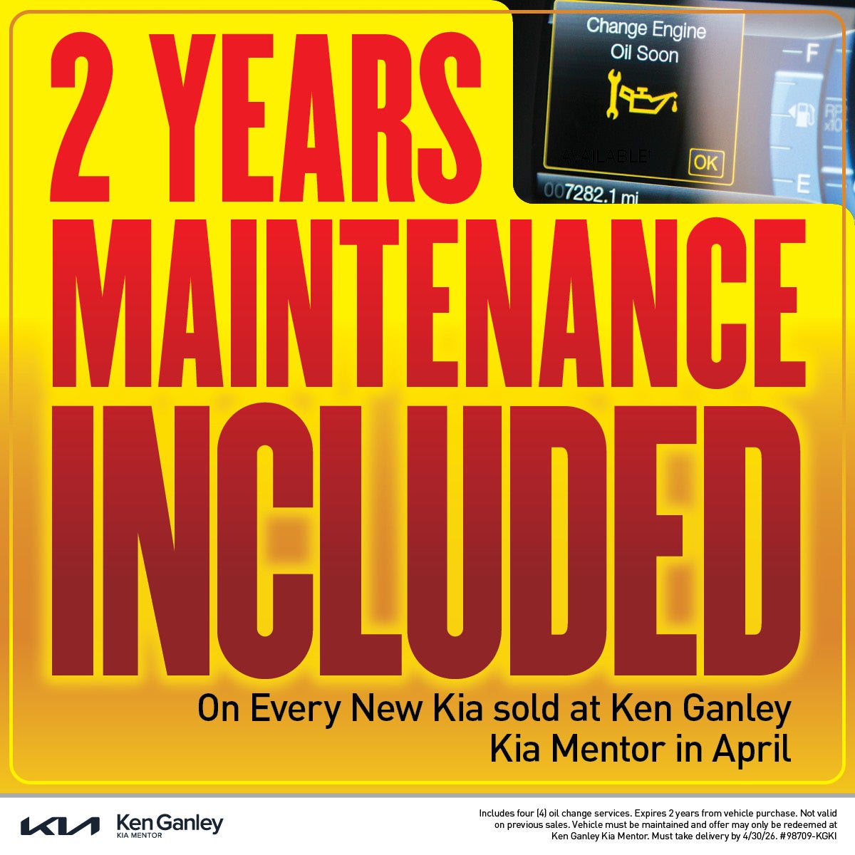 Includes four (4) oil change services. Expires 2 years from vehicle purchase. Not valid on previous sales. Vehicle must be maintained and offer may only be redeemed at Ken Ganley Kia Mentor. Must take delivery by 4/30/26. #98709-KGKI