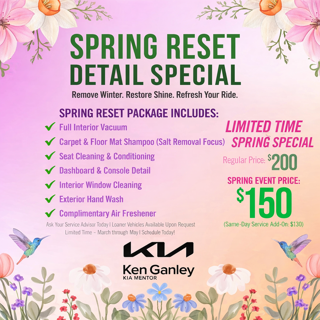 Winter took a toll on your vehicle, now it’s time for a ???????????? ??????????! Our ???????????? ?????????? ???????????? ?????????????? will remove winter salt, refresh your interior, and restore that showroom shine Full Interior Vacuum Carpet & Floor Mat Shampoo Seat Cleaning & Conditioning Interior Window Cleaning Exterior Hand Wash + Tire Shine ???????????? ?????????? ??????????: $?????? (?????????????????? $200) Limited Time: March 2026 – May 2026 Ask your Service Advisor or schedule today at Ken Ganley Kia Mentor!